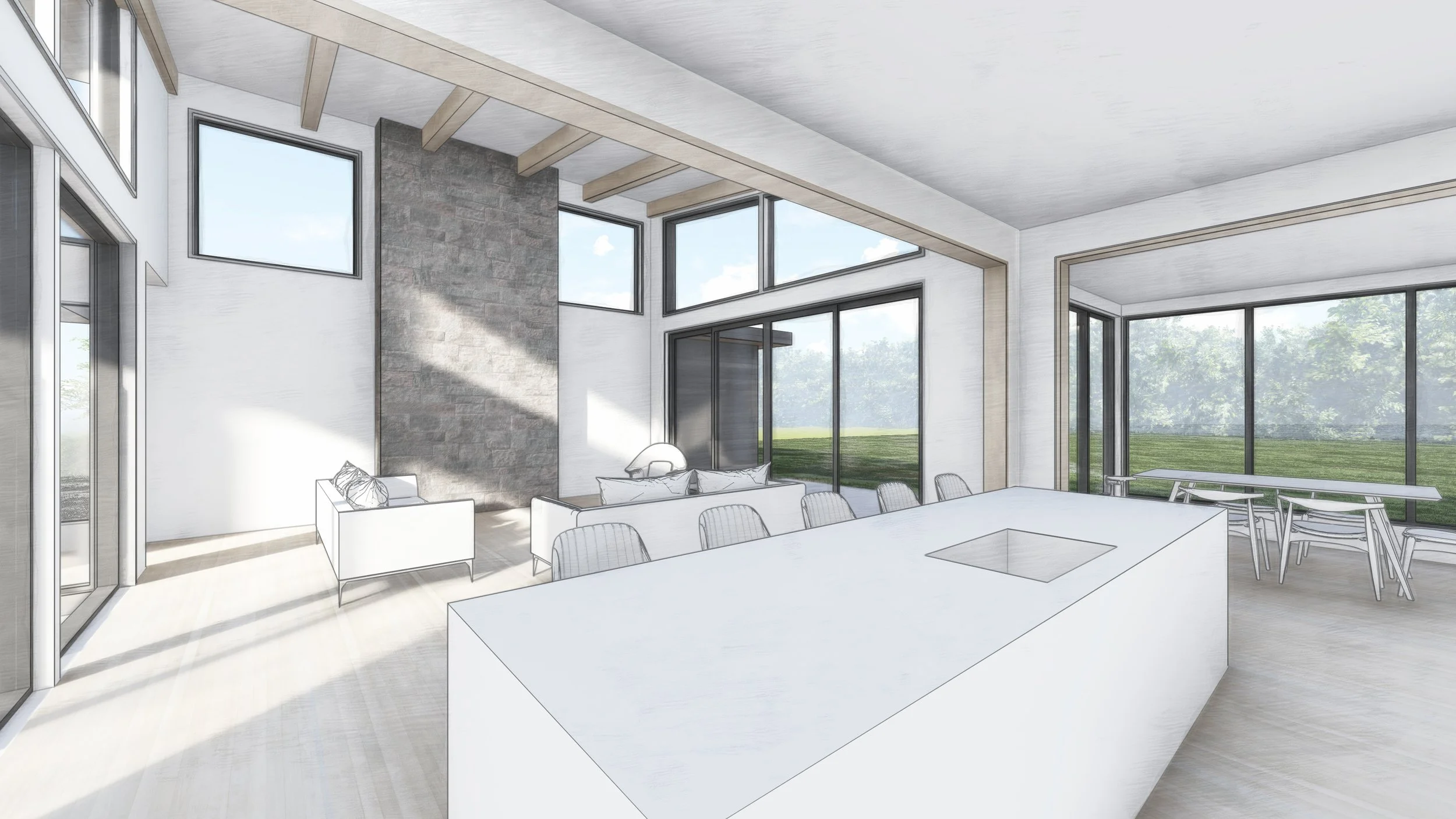 Designed to meet the owners’ desire for single-story living, this low-lying, sprawling home takes subtle inspiration from midcentury modern precedents. The vaulted shed roof defines the central living space, bringing in natural light and connecting to outdoor views. An entry courtyard provides a welcoming procession, enhancing the sense of arrival and reinforcing the home’s connection to the landscape. The plan separates public and private zones, with an open living, dining, and kitchen area at the core and a private wing housing the bedrooms, offering both comfort and separation.