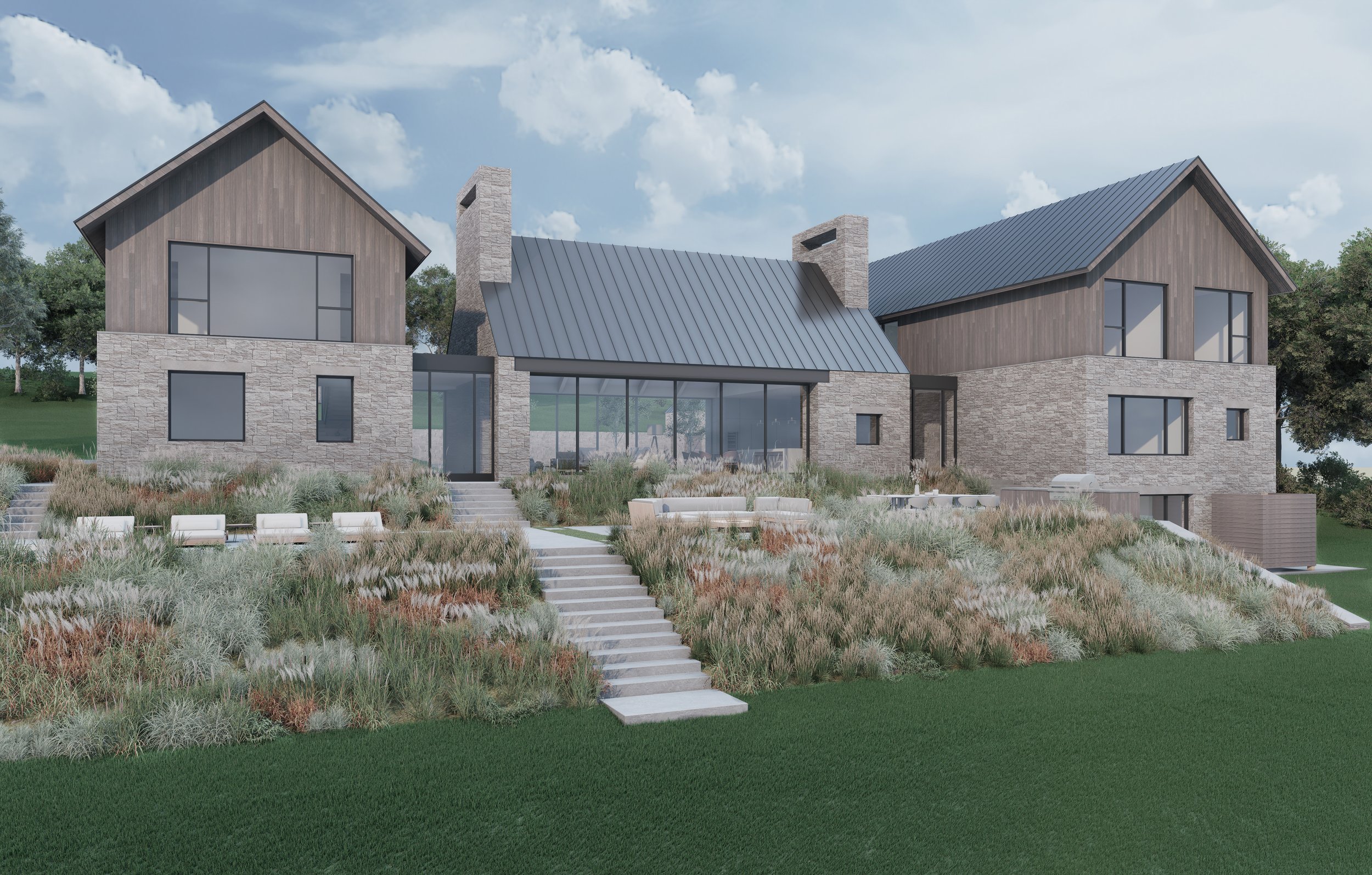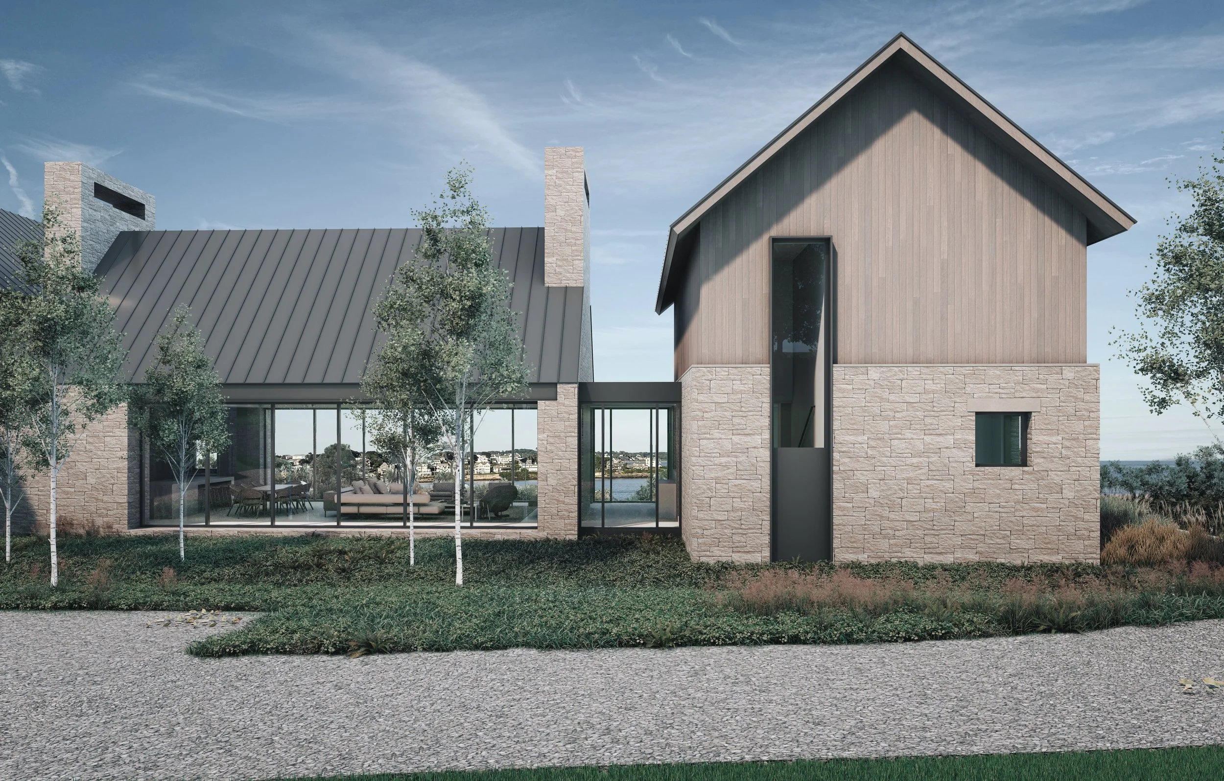 Perched up on the cliffs overlooking the ocean, our Narragansett project blends historic New England forms with contemporary detailing. Inspired by Rhode Island’s historic stone-enders - early colonial homes defined by their massive end chimneys - the design is anchored by stone volumes paired with gabled wood clad structures. Traditional forms are refined with contemporary detailing and clean lines.