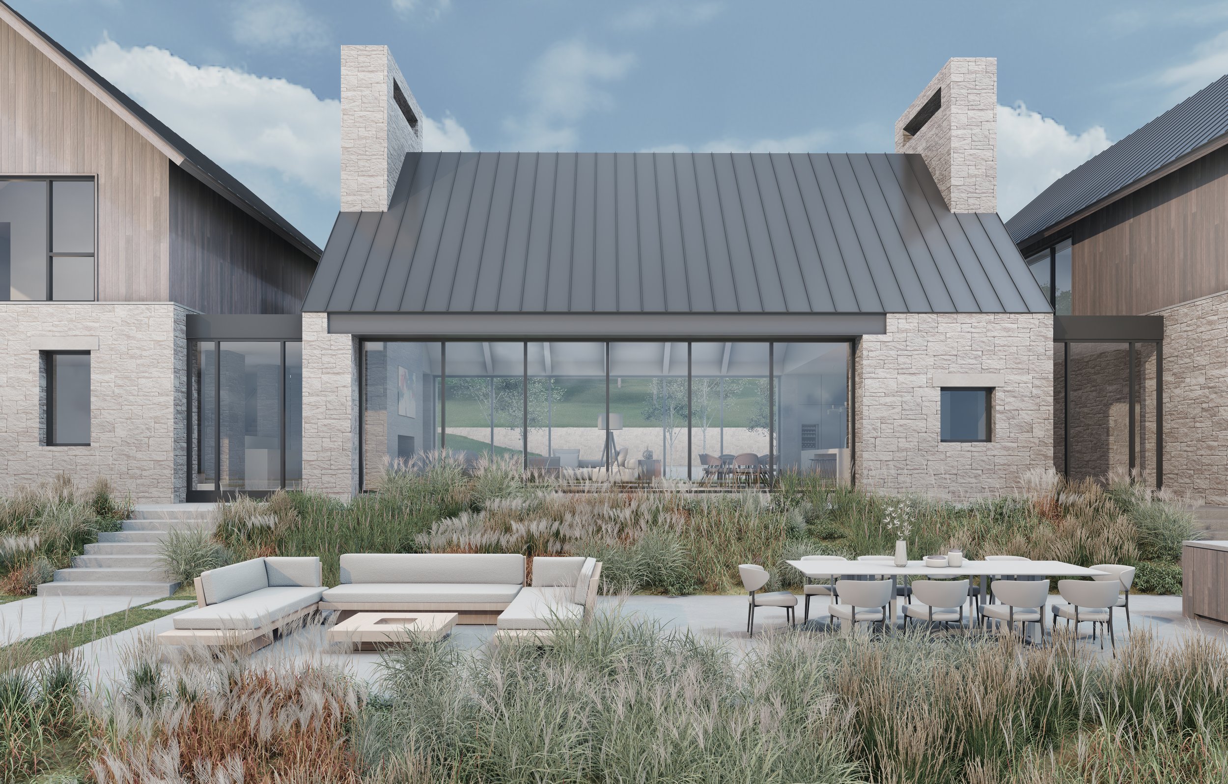 At the heart of the home a vaulted central volume serves as the main public space for cooking, dining, and gathering. Expansive glass opens this zone to the landscape, creating a strong indoor-outdoor connection. Two flanking wings offer privacy and retreat - one for the primary suite, and the other for guests - linked by a transparent corridor that emphasizes views and reinforces the separation of program.